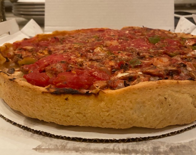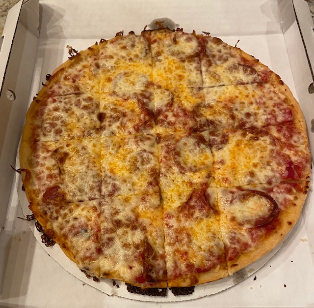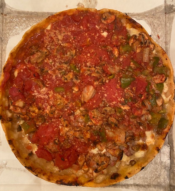 Lou Malnati’s is a Chicago institution, so I was looking forward to tasting it. They only opened the pick-up-only location in Schererville last year, I believe. I do have to say, they appear to have a good pandemic plan. The location ONLY offers curbside pickup – you can’t go inside. You tell them what car you’re driving and they bring your order out. So for that, well done!